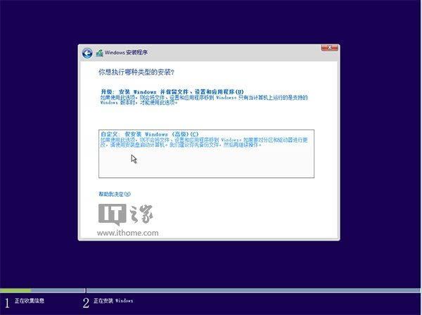 ▲由于我们目前执行纯净安装,因此要选择第二项“自定义”安装方式