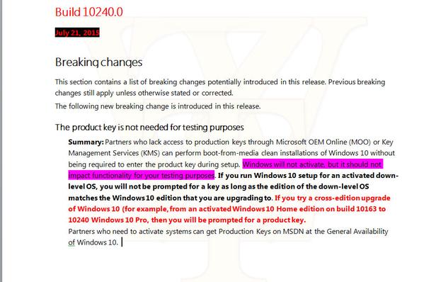 知名俄罗斯泄密者WZor分享的Windows 10更新日志中写道,在安装和首次重启进入系统的时候并不立即需要产品密钥,自然Windows系统处于未激活状态,但是在你体验测试系统的时候功能都不会进行限制。这听上去是否有点熟悉,因为在Windows 7系统也有类似的情况。当然,作为如果想要长期使用系统推荐依然需要通过输入产品密钥。