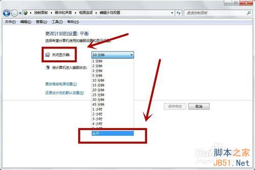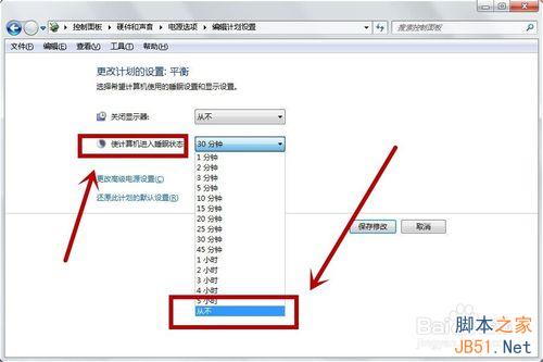 【六】在“使计算机进入睡眠状态”栏目里选择“从不”,或者依据个人喜好设置相应的时间。设置完成后,点击“保存修改”即可。