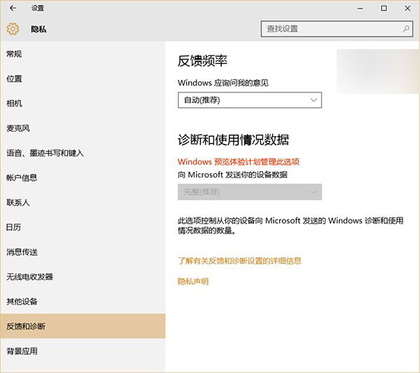 在Win10“设置”中,进入“隐私”,选择“反馈和诊断”,就会发现“诊断和使用情况数据”中的“向Microsoft发送你的设备数据”默认使用了“完全(推荐)”选项,无法更改,而且微软做了红色标注“Windows预览体验计划管理此选项”。也就是说,Win10会把当前设备的诊断和使用情况数据完完全全的发送到微软,而且用户本身无法掌控数据内容和数量。