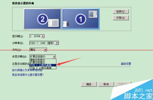 2、在多显示器那边,原先是“扩展这些显示”,把它改成“只在1上显示桌面”。然后点击“应用”或“确定”。
