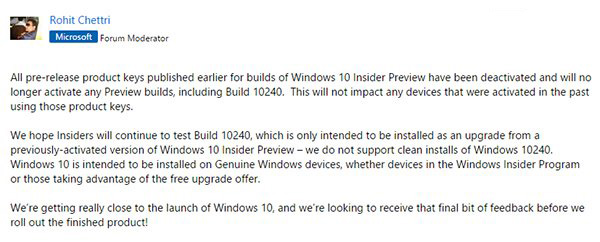 全新安装后的Win10预览版确实已无法使用之前的密钥进行激活,但是Gabe Aul对于这一情况的解释并不是很清楚。现在我们从微软问答社区管理人员Rohit Chettri的一篇文章中找到了比较明确的解释: