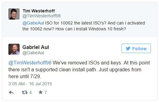 一位网友在推特上询问微软Windows Insider项目负责人Gabe Aul:“目前最新的ISO镜像是10062?我现在还可以激活10162吗?我该怎样全新安装Win10?”对此,Gabe Aul表示:“我们已经删除了所有ISO镜像和Key。当下不支持执行全新安装。7月29日之前请选择升级(而不是全新安装)”。