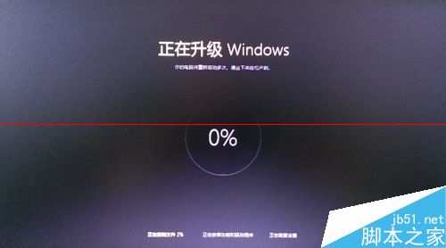 4、这次重启终于进入了新版本的安装进程。整个进程分为“复制文件”、“安装功能和驱动程序”、“配置设置”三大阶段,在屏幕中间的圆圈,显示出当前的进度比例。系统将会多次自动重启。