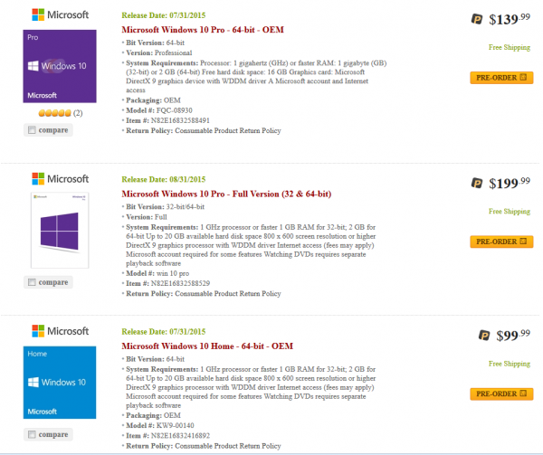 - 32位家庭数字版:99.99美元- 64位家庭数字版:99.99美元- 32/64位家庭光盘版:119.99美元- 32位专业数字版:139.99美元- 64位专业数字版:139.99美元- 32/64位专业光盘版:199.99美元光盘版的定价和微软官方是一致的,数字版微软还有说,应当也是这些。那么厚道在哪儿呢?新蛋搞了个限时优惠,两个光盘版现在下单均可享受10美元的优惠,购买时输入折扣码即可:家庭版EMCAVKR222、专业版EMCAVKR223。