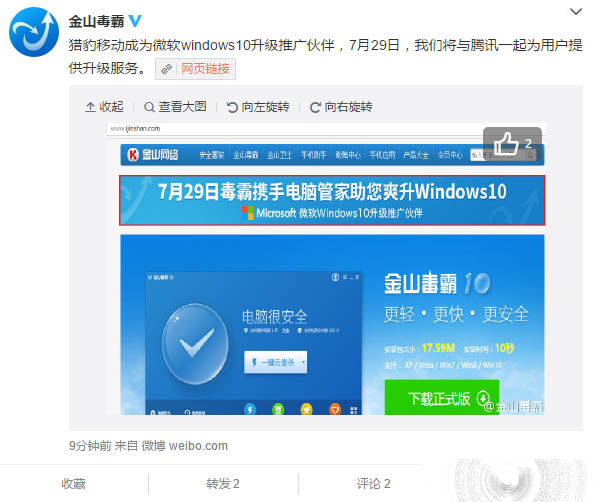 现在,免费升级Windows 10又有了新途径。今天下午,金山毒霸通过官方微博宣布,其开发商