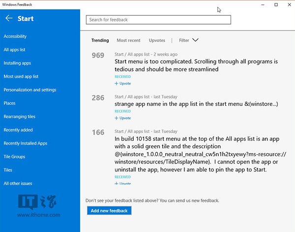在Windows10内置的“反馈”应用中,开始菜单“复杂,冗长,程序分类不科学”是美国区用户反映较多的问题。他们认为现有Win10开始菜单设计较为繁杂,使用起来并不方便,而且“所有程序”的分类比较杂乱,Windows应用和传统Win32应用并没有区分开来,查找起来较为麻烦。