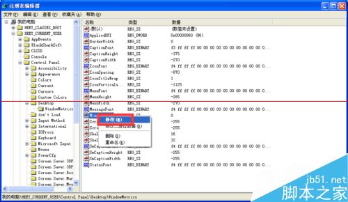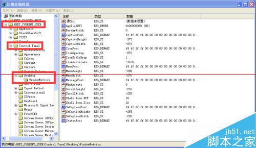 4、然后展开HKEY_CURRENT_USERControl PanelDesktopWindowMetrics。
