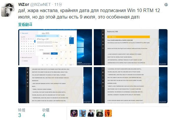 WZor在Twitter中表示,7月12日将会是Windows10 RTM最早的“亮相”时间,但在此之前的7月9日将会是非常特殊的一天。WZor在这条推文下给出了昨天7月9日Sign-Off的截图,以及微软美国总部所在地7月3日至6日的天气情况,按他的话说这几天“很热”(这貌似和推文内容没啥关系)。