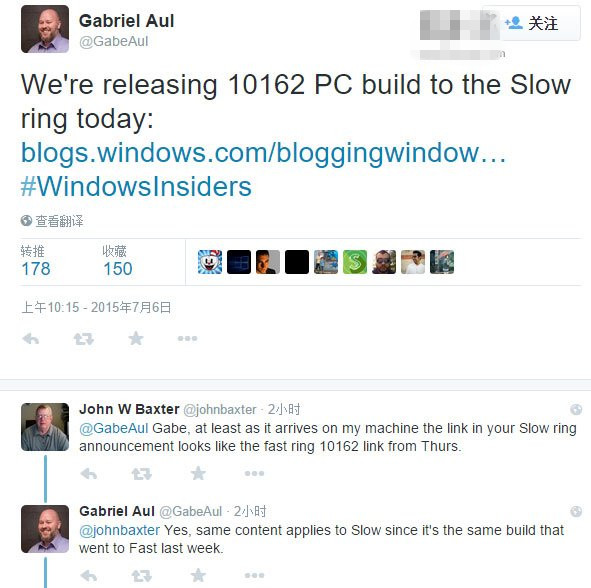 Gabriel Aul还是像之前一样在Twitter上公布了这则消息。不过细心的网友发现,他给出的博客链接和上周发布快速版时没有区别。这位负责人对此解释道,本次慢速版更新内容和上周的快速版相同。两个不同的通道推送相同的内容,说明Win10预览版10162没有明显问题。根据昨天WZor给出的消息,Win10 RTM将在美国时间7月9日签署完成,从Build 10162的稳定程度来看,RTM“顺产”的可能性非常大,也许两三天之后我们就可以看到Win10 RTM完成的消息。