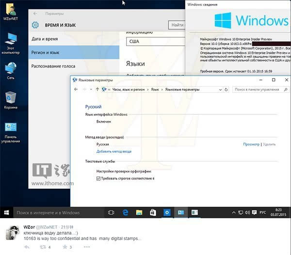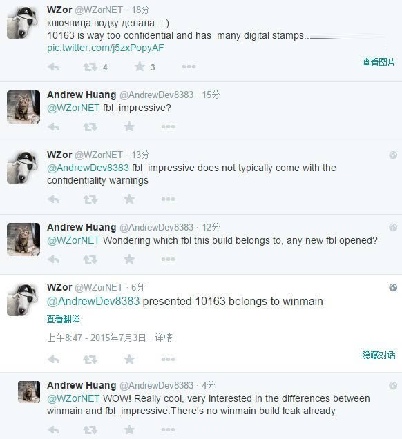 有网友问到,曝光的Build 10163是否为fbl_impressive分支,WZor回答说fbl_impressive分支不必如此“遮遮掩掩”,右下角不会有保密警告信息。随后,这位网友进一步问到该版本属于哪个fbl分支,WZor告诉他“ 截图所示的Build 10163属于winmain分支”。这位网友得知此消息后显得非常激动,表示之前还没见过winmain分支的版本泄露。