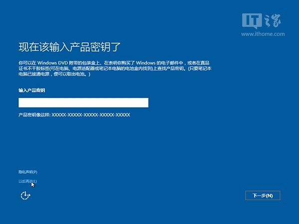 ▲提示“现在该输入产品密钥了”,如果你还是觉得打字麻烦可以点底部的“以后再说”继续跳过。这里选择跳过。