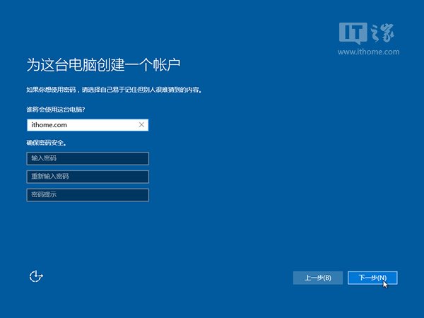 ▲ 创建本地账户。输好帐户名和密码(可空)后点“下一步”