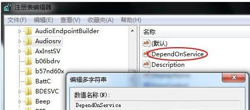 3、然后找到并双击“DependOnService”项,在打开的窗口中,将数值数据框中的“MMCSS”删掉,然后保存退出注册表即可。