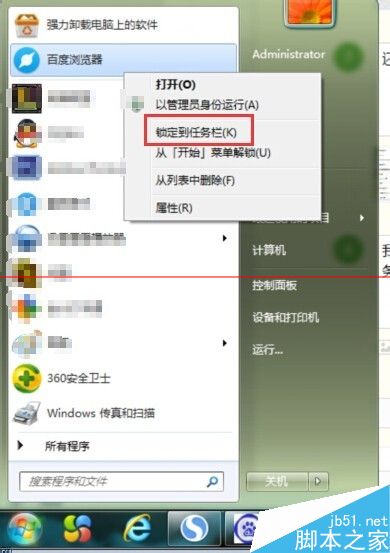 8、我经常用到百度浏览器,那么我在所有程序中用鼠标的右键点击选择”锁定到任务栏“就行了。