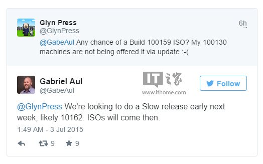 关于下一个慢速版的推送时间,Insider项目负责人在推特上表示:“我们当前正在准备,下个Win10预览版慢速更新有望在下周早些时候到来,版本很可能就是今天推送的10162版本,届时也将发布ISO镜像下载。”