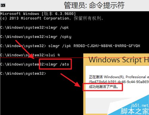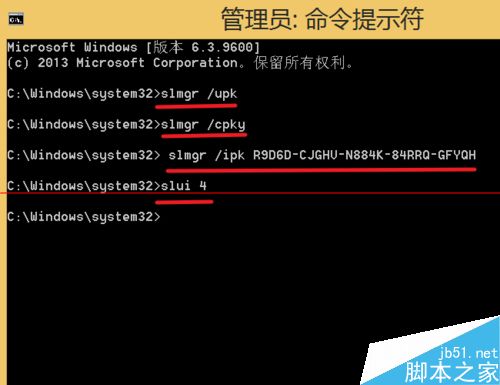 8、回到Win8.1桌面,按Win键+X 选择管理命令提示符,按下面的的顺序输入命令,关于每个命令的说明可以去百度一下有很详细的说明,重点说一下第三个命令,这里有一个KEY,这命令是将你Win8.1原有的KEY置换成现在这个KEY,为什么要置换,因为这个KEY是保证可以电话激活的KEY,若这个KEY不能电话激活,就需要重复命令去网上找一个可以电话激活的KEY。