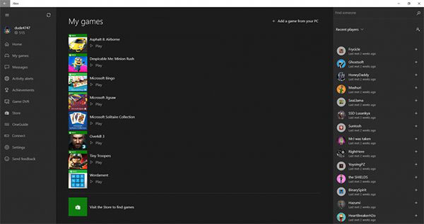 • 我的游戏——当你从Windows商店中下载游戏后,它们将出现在“我的游戏”列表里,另外,你还可以管理增加收藏游戏,选择“我的游戏”——从电脑中增加游戏。另外在屏幕主页上还有推荐游戏,位于近期游戏列表下方。
