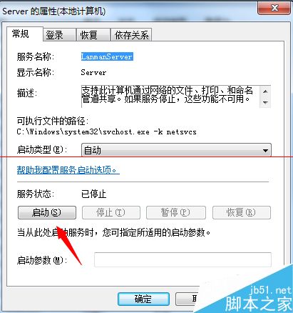 3、在弹出的服务对话框,找到【server】服务,双击进入设置对话框
