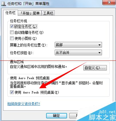 2、进入任务栏界面,将【使用Aero peek预览桌面】选项关闭,点击确定