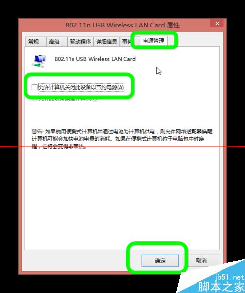 5、最后在新打开的窗口中进入“电源管理”界面把“允许计算机关闭此设备以节约电源”的勾去掉,然后点击“确定”即可。