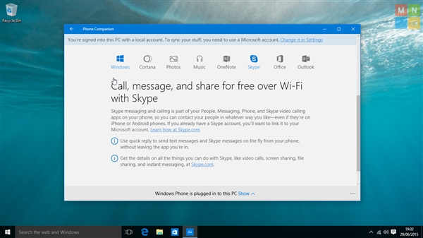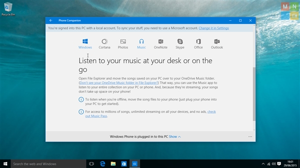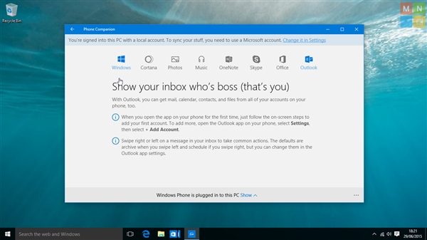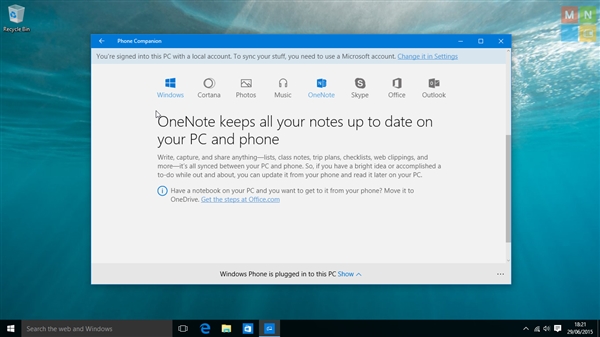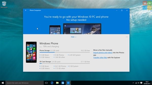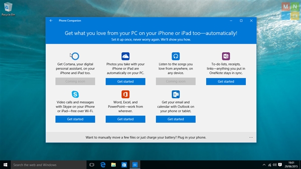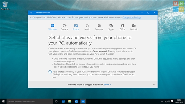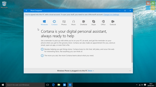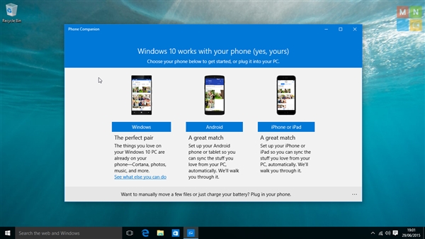 微软在宣布小娜登陆iOS/Android时,同时提到的还有一个内置于Win10的应用“Phone Companio”(手机伴侣)。它有什么用呢?其实有点类似于iTunes。Phone Companio的作用就是便于用户将PC与智能手机连接进行数据传输,支持iOS(iPhone+iPad)、Android和Windows Phone。(BlackBerry、Firefox碎碎念中……)。