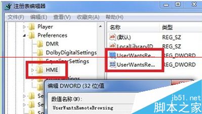 7、在打开的注册表编辑器窗口中,依次展开以下注册项HKEY_CURRENT_USERSoftwareMicrosoftMediaPlayerPreferencesHME,然后点击HME项,然后在右侧窗口分别双击字符串值UserWantsRemoteBrowsing及UserWantsRemoteSharing,将数值数据修改成2(十六进制),保存后退出注册表就可以了。