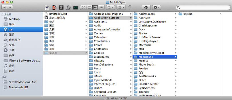 在资料库中,可以找到“Application support”文件夹,继续前往下级Mobilesync文件夹里面的backup就是备份文件所在的地方了。