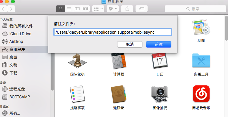 二、另外一种更加便捷的方法是在Finder下直接通过快捷键commnd+shift+G打开前往文件夹,直接复制:用户名/Library/application support/mobilesync然后回车,打开backup里面的就是了。
