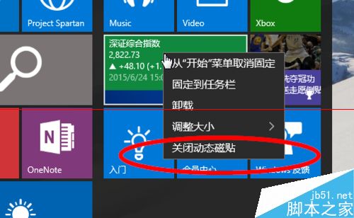 3、在动态磁贴上点击右键,然后选择“关闭动态磁贴”