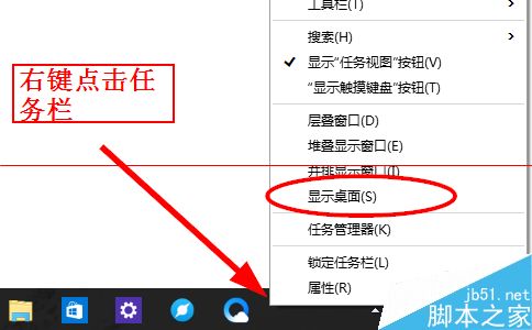 方法三:1、右键点击任务栏,从菜单中选择“显示桌面”
