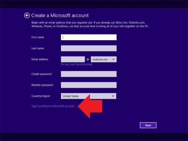 然后在跳出的屏幕上选择“不使用微软帐号进行登陆”。这条链接非常的小,如果不仔细观看很难发现。