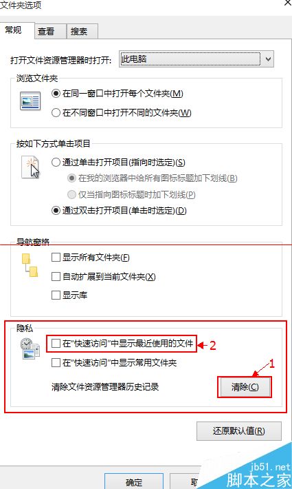 3、在“文件夹选项”对话框中,找到“隐私”一栏。点击“清除”,同时去除“在快速访问中显示最近使用的文件”的勾选,“确定”,如图所示。