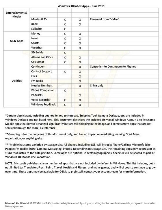 详细列出了Win10桌面版和移动版内置应用的完整清单(“X”表示“有”)。可以看到,对于桌面版来说,名单涵盖了Windows10家庭版、专业版、教育版以及企业版。其中,