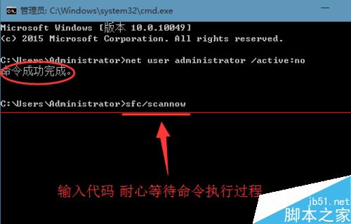 3、出现“命令完成成功”后,再次输入“sfc/scannow”,回车确认,