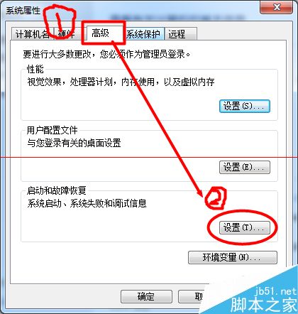 3、切换到“高级”选项卡,然后,点击“启动和故障恢复”中的“设置”。