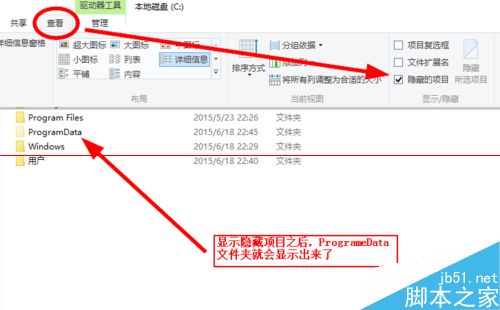 4、如果没有显示隐藏的文件夹,则把“显示隐藏文件夹”选项打开,在资源管理器中点击“查看”->"隐藏的项目",打上钩,此时ProgrameData文件夹就会显示出来了