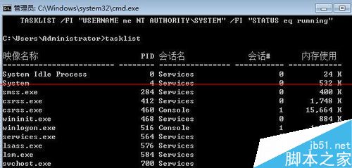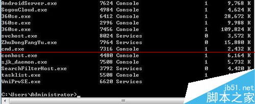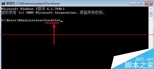 7、然后这里输入命令tasklist【任务列表命令】回车,这样可以查看电脑上正在运行的进程。