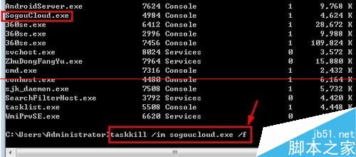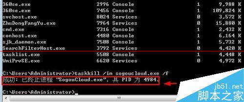 8、我们这里可以试试输入命令能不能关闭刚才无法关闭的进程taskkill /im sogoucloud.exe /f然后回车,这里的sogoucloud.exe是你要关闭的进程名字,/f是强制关闭的意思。
