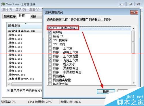 11、出现的窗口中将进程标识符前面选择上,然后点击确定。这样可以在任务管理器中显示进程PID标识。这样任务管理器中就显示出了每个进程的PID。大家一定要记住这个PID哦。一会要用哦!