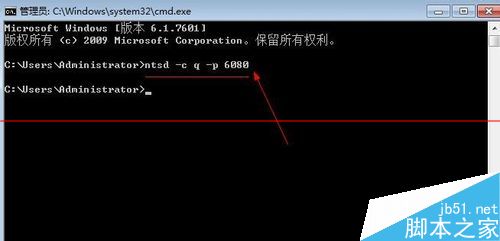 12、现在我们再次打开电脑命令提示符窗口,输入命令ntsd -c q -p 6080然后回车,这里的6080是刚才我们无法关闭的进程PID数字,这样就可以关闭无法关闭的进程了。再次打开任务管理器,发现关闭成功。