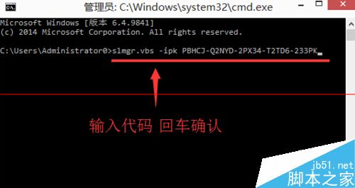 2、输入“slmgr.vbs -ipk PBHCJ-Q2NYD-2PX34-T2TD6-233PK”,按回车确认激活。