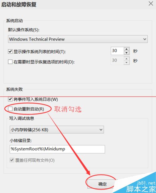 4、在“启动和故障恢复”中,点击取消勾选“自动重新启动(R)”点击“确定”完成。