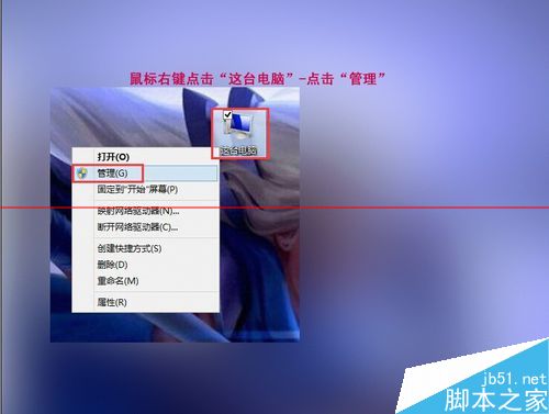 鼠标右键点击“这台电脑”跳出选择菜单后点“管理”。