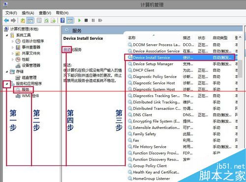 选择“服务和应用程序”--点击“服务”--去右侧找到并点击,“Devic Intall Service”选项,点击“启动”(看下面图片)。