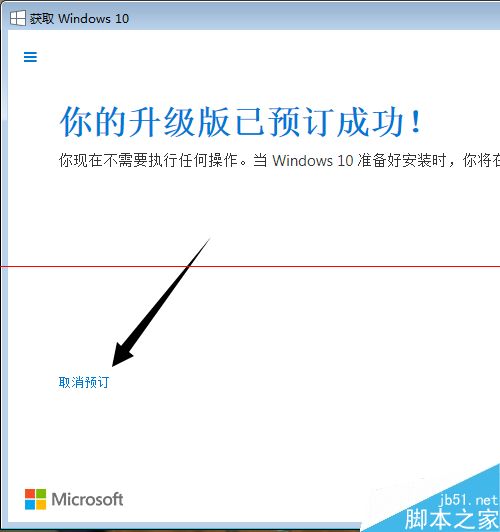 2、在提示你已预订成功窗口的左下角,点击【取消Win10升级预约】。