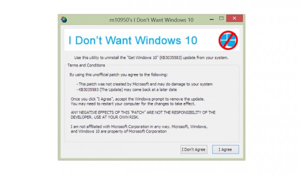 在Windows 7或8.x当中运行这个小工具,它将删除补丁KB3035583,然后用户重新启动电脑,从而杀死一直赖在系统通知区域不走的Windows 10升级通知。该开发者已经提供了这个小工具的源代码供用户查看。