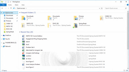 导航窗格右边作为主内容区域显示相同的文件夹。文件夹与固定到它们旁边的是那些永远不会自己离开的。我们一开始向你展示几个常用文件夹,但你可以完全控制固定的内容。如果你发现没有固定的文件夹,这些都是你经常使用的文件夹。当你执行打开文件、创建新文件等操作时,包含的文件夹的频率得分会增加。一旦它超过某一阈值时,它会开始显示在快速访问作为一个常用文件夹。我们将展示多达4个常用文件夹,它们一直在固定的文件夹下面。因为我们只显示4个得分最高的文件夹,这个清单可能随时会改变。如果你想确保文件夹不会消失,只要固定它就可以。最后,在内容区域我们显示最近的文件。这些只是按照时间顺序,并显示它们的路径。