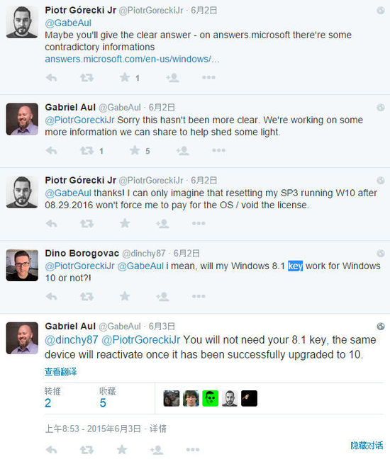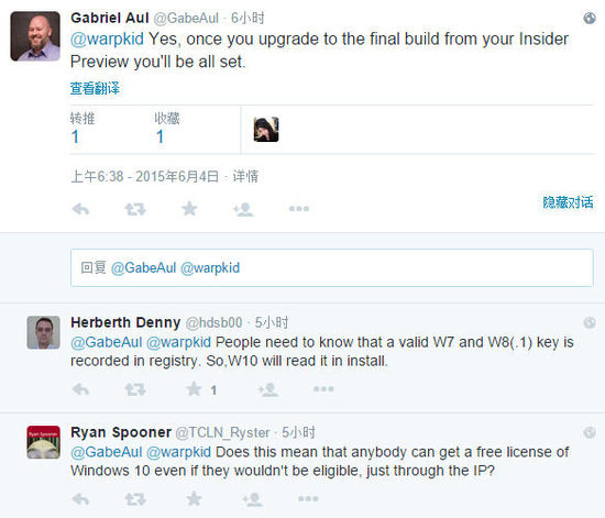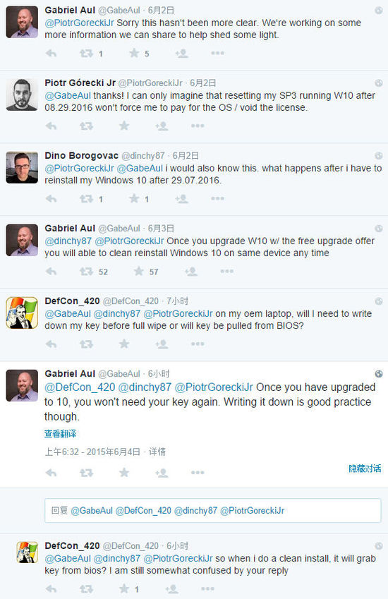 有网友问到,他在升级Windows 10预览版时,之前的Windows 8已经没了,之后是否还有机会升级到正式版。Gabe给出的答复是可以的,一旦从预览版升级到正式版后,一切都搞定了。