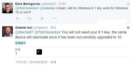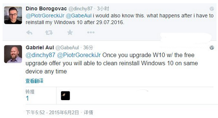 微软Win10预览体验计划负责人Gabriel Aul今天在Twitter上回答了用户的相关问题,他表示一旦用户设备升级到Win10,任何时间都可以免费重装。随后,用户又以Win8.1为例,询问这位负责人自己的Win8.1账号是否在Win10中依然有效。